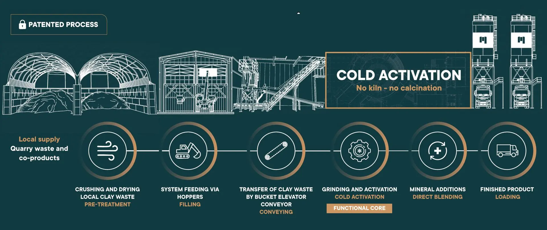 La technologie CCC® repose sur un procédé propriétaire d’activation mécano-chimique de l’argile à froid. Contrairement aux procédés cimentaires traditionnels ou aux technologies d’argile calcinée, ce procédé fonctionne sans cuisson, sans calcination et sans flashage thermique.