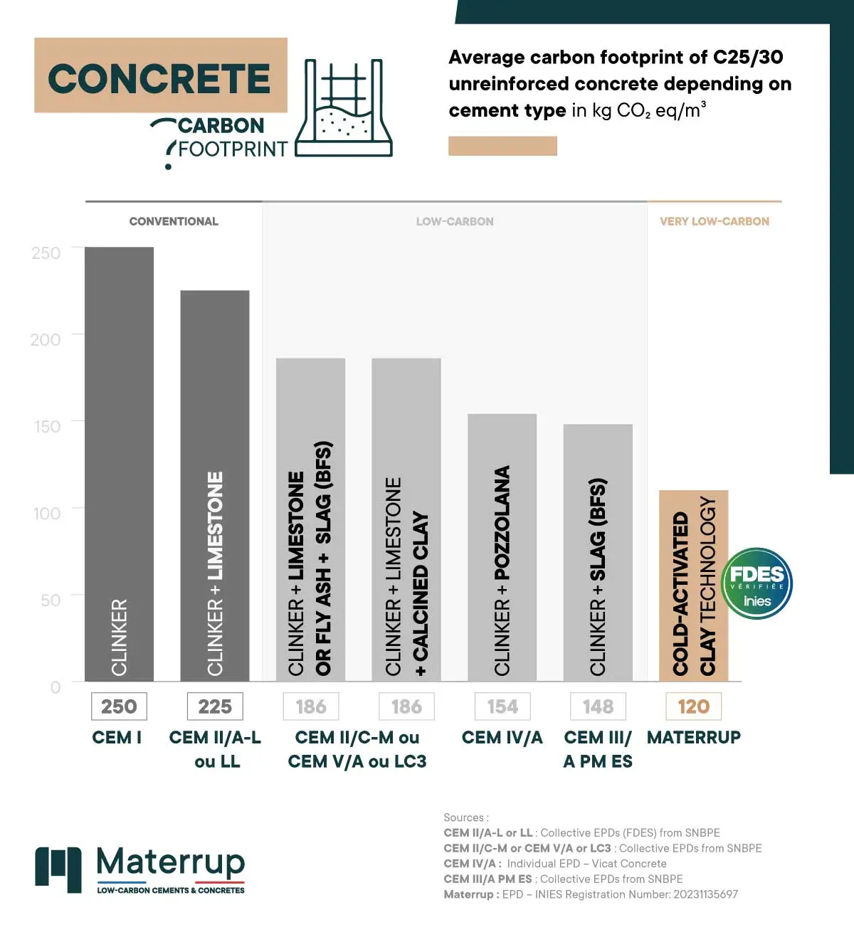 -45% carbon footprint with the Précoffré® standard Materrup X FEHR, at just 22.2 kg CO₂ eq./m² compared to 40.2 kg CO₂ eq./m² with conventional CEM I cement..